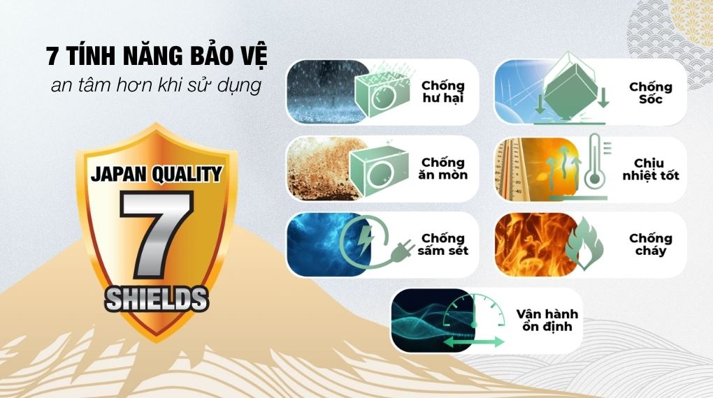 Sharp còn trang bị 7 tính năng bảo vệ nhằm tăng độ bền và độ ổn định cho máy. Nhóm tính năng này hướng đến khả năng vận hành bền bỉ hơn trong điều kiện thời tiết nóng ẩm hoặc khi thiết bị phải hoạt động thường xuyên.