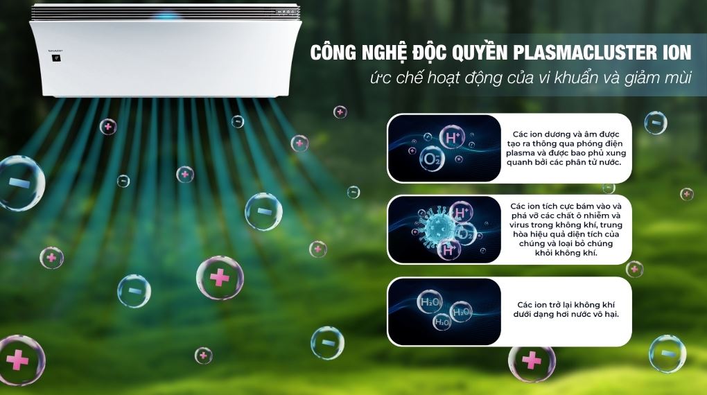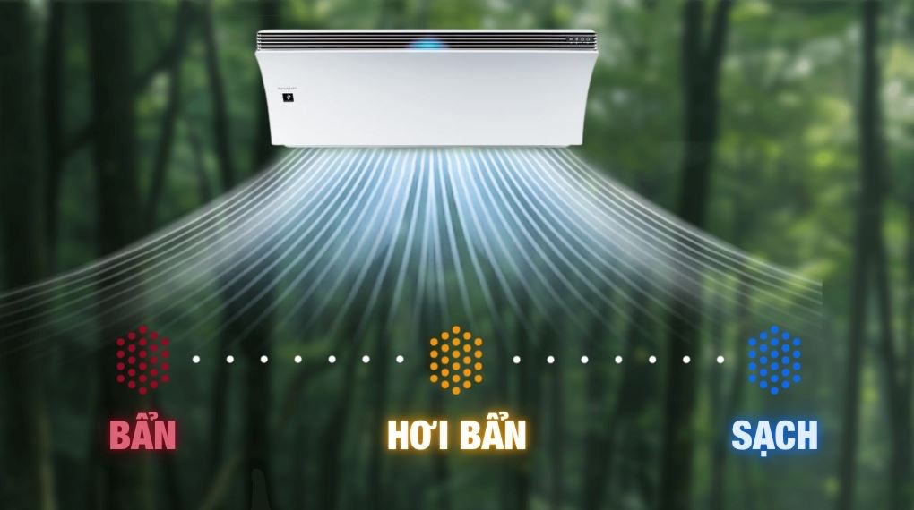 Sau khi không khí đi qua hệ thống lọc, máy tiếp tục hỗ trợ xử lý bằng công nghệ Plasmacluster ion . Công nghệ này của Sharp tạo ra các ion dương và ion âm, sau đó phát tán vào không khí để bám lên một số tác nhân gây hại, từ đó hỗ trợ ức chế hoạt động của vi khuẩn và giảm mùi trong phòng. Sau khi tham gia vào quá trình này, các ion trở lại môi trường dưới dạng nước vô hại, góp phần giữ không gian sống dễ chịu hơn trong quá trình sử dụng.