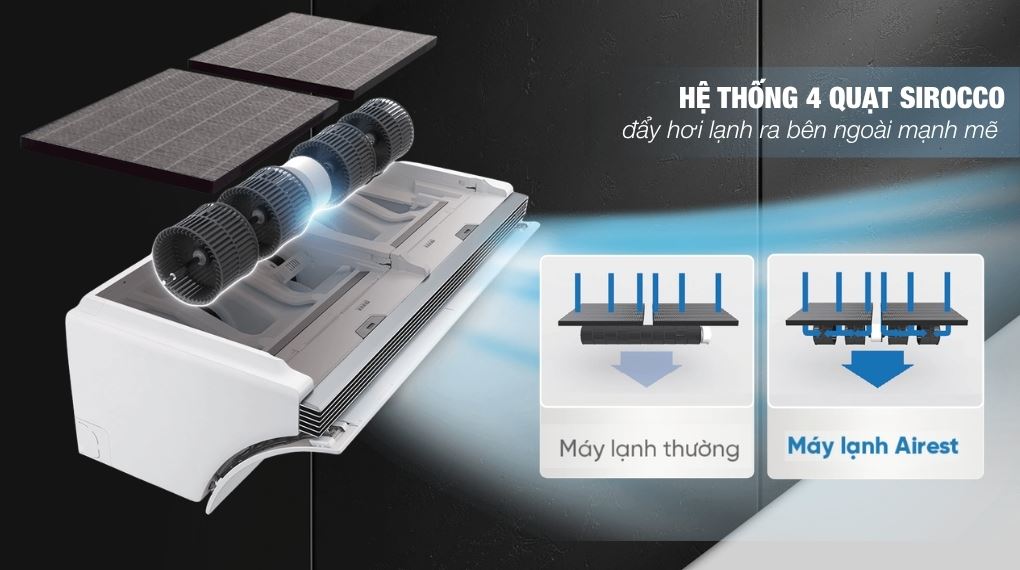 Hệ thống 4 quạt Sirocco tạo luồng gió áp suất cao với lưu lượng lớn, giúp hút không khí qua lớp lọc dày mà máy vẫn duy trì khả năng thổi gió mạnh và ổn định. Nhờ đó, luồng khí sạch có thể lan tỏa xa đến 15m, hỗ trợ làm mát và lưu thông không khí hiệu quả hơn trong phòng.