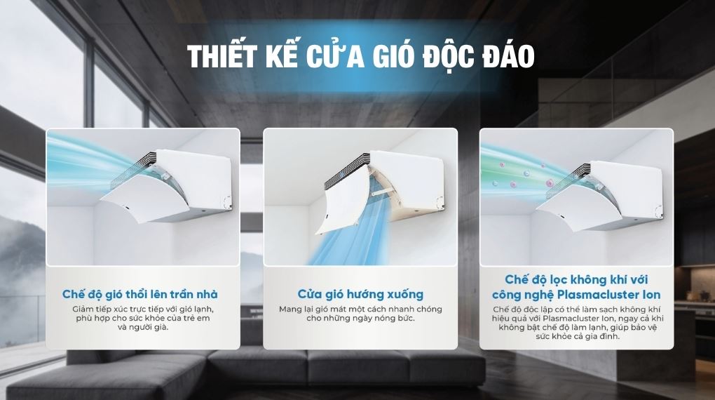 Chế độ gió thổi lên trần nhà: Luồng khí vận hành theo cơ chế Coanda, tức là hơi lạnh đi men theo trần rồi lan tỏa dần xuống không gian. Cách thổi này giúp hơi mát phân bổ đều hơn trong phòng, đồng thời giảm cảm giác gió lạnh thổi trực tiếp vào người. Đặc biệt khi bật chế độ Plasmacluster ion, máy cũng ưu tiên thổi gió lên để ion được phát tán từ trên cao xuống, hỗ trợ làm sạch không khí trong phòng. Chế độ gió hướng xuống: Luồng khí lạnh được đưa thẳng xuống khu vực sử dụng, nhờ đó tạo cảm giác mát nhanh hơn trong những ngày oi bức hoặc khi người dùng vừa mới bật máy.