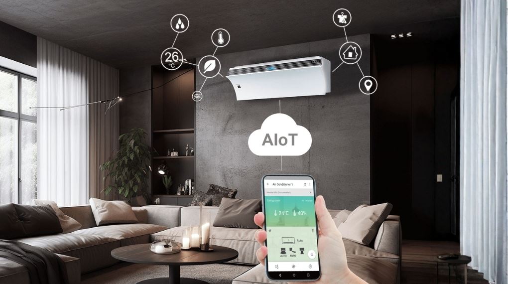Máy lạnh còn hỗ trợ điều khiển bằng điện thoại nhờ kết nối Wi-Fi và tích hợp công nghệ AIoT . Nhờ đó, người dùng có thể bật tắt máy, điều chỉnh chế độ hoặc quản lý thiết bị từ xa linh hoạt hơn so với cách dùng remote thông thường.
